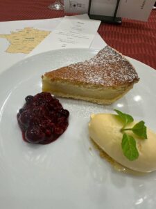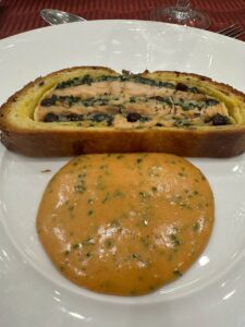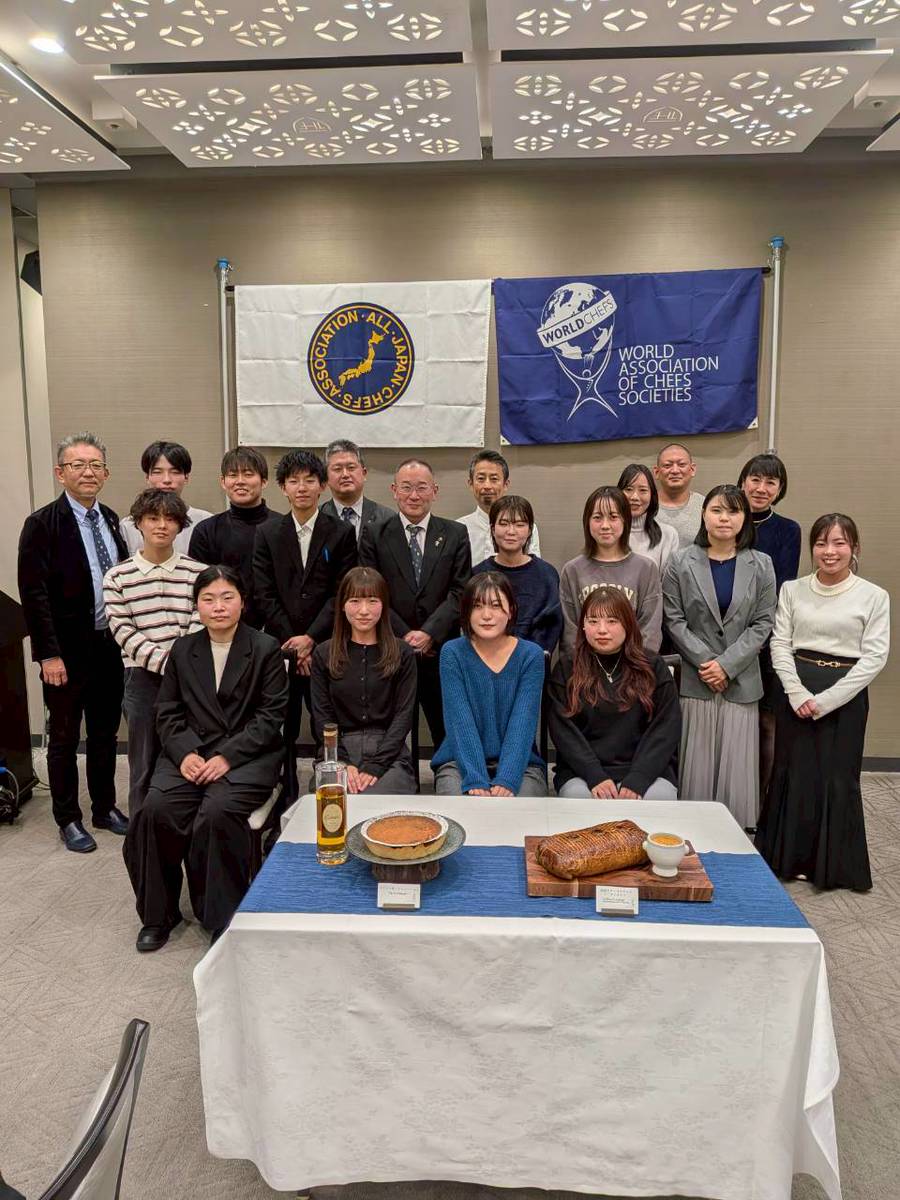 テーマは「伝統的なフランス料理」とし、第一部では京都府本部副会長の伊藤道彰シェフに講師を依頼。フランスの地図を使ってシャンパーニュの製法や、フランス料理の基礎となる古典料理や地方料理の伝統について分かりやすくご説明いただきました。その後の賞味会では、(株)円居の取締役総料理長佐野一成シェフによる秋鮭のクーリビヤックをメインとした3品を堪能。後半の講習会では引き継ぎ佐野シェフからそのルセットやこだわりなどを教えていただきました。